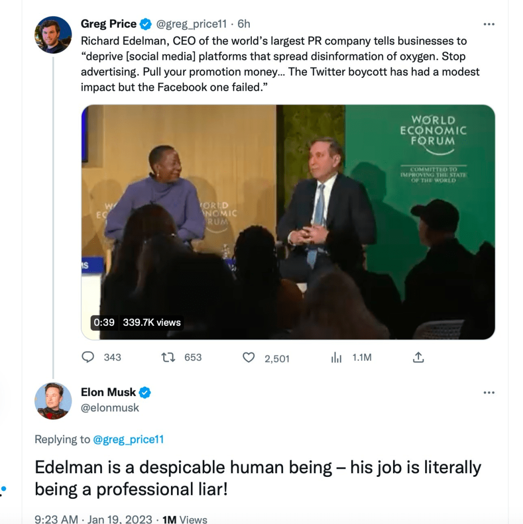 And then Elon Musk, heard that Richard had suggested in one of his many interviews that businesses stop advertising on social media platforms that do not curb hate speech and said he was a “despicable human being” and that his job (and by extension all PR professionals) “is literally being a professional liar”.